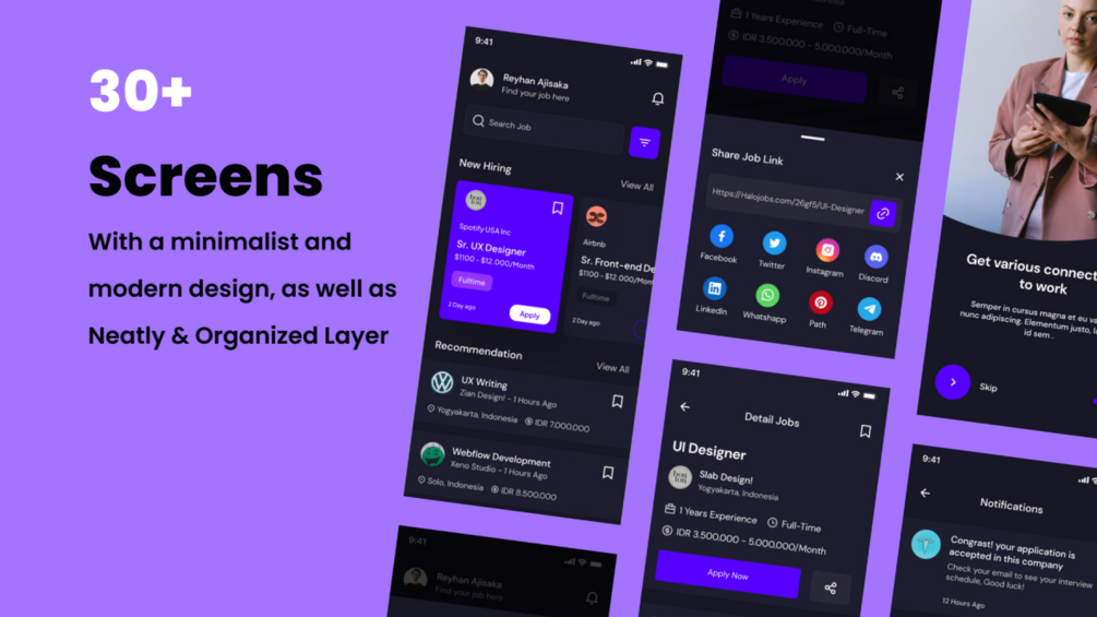 Getjobs is a Premium and High-Quality Jobs Finder Mobile App UI Kit With 30+ High-Quality Screens And Easy To Use In Figma.