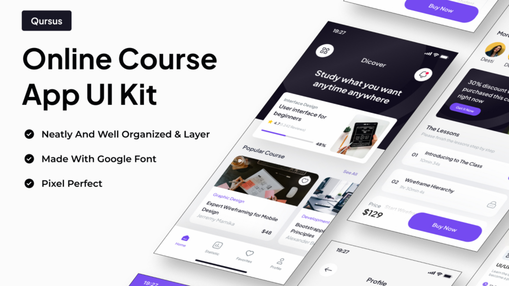 Qursus is a High Quality UI Kit of an Online Course Mobile App UI Kit. Qursus came with a modern minimalistic design. The kit has been equipped with grouping and naming for each group so that you can edit it more easily.
